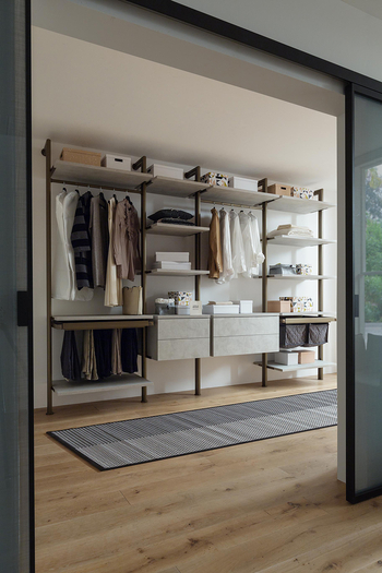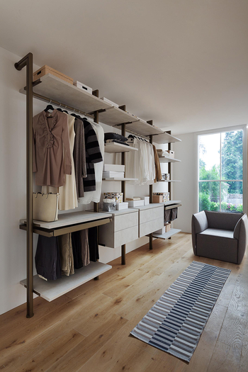 Le mensole si possono spostare tranquillamente in altezza o inserire in un secondo momento semplicemente allentando due viti, sono disponibili anche accessori quali tubi portabiti e cassettiere per creare scaffalature per cabine armadio, ripostigli e negozi.