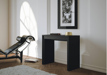 Proposta nella finitura nero opaco è inoltre possibile personalizzarla con qualunque colore opaco della cartella RAL (specificare nell'ordine il num.RAL desiderato). Il meccanismo di allungo di Arcobaleno 90 è realizzato con guide telescopiche in alluminio e con sostegno centrale a scomparsa girevole per garantire una migliore stabilità senza arrecare disturbo agli ospiti presenti.