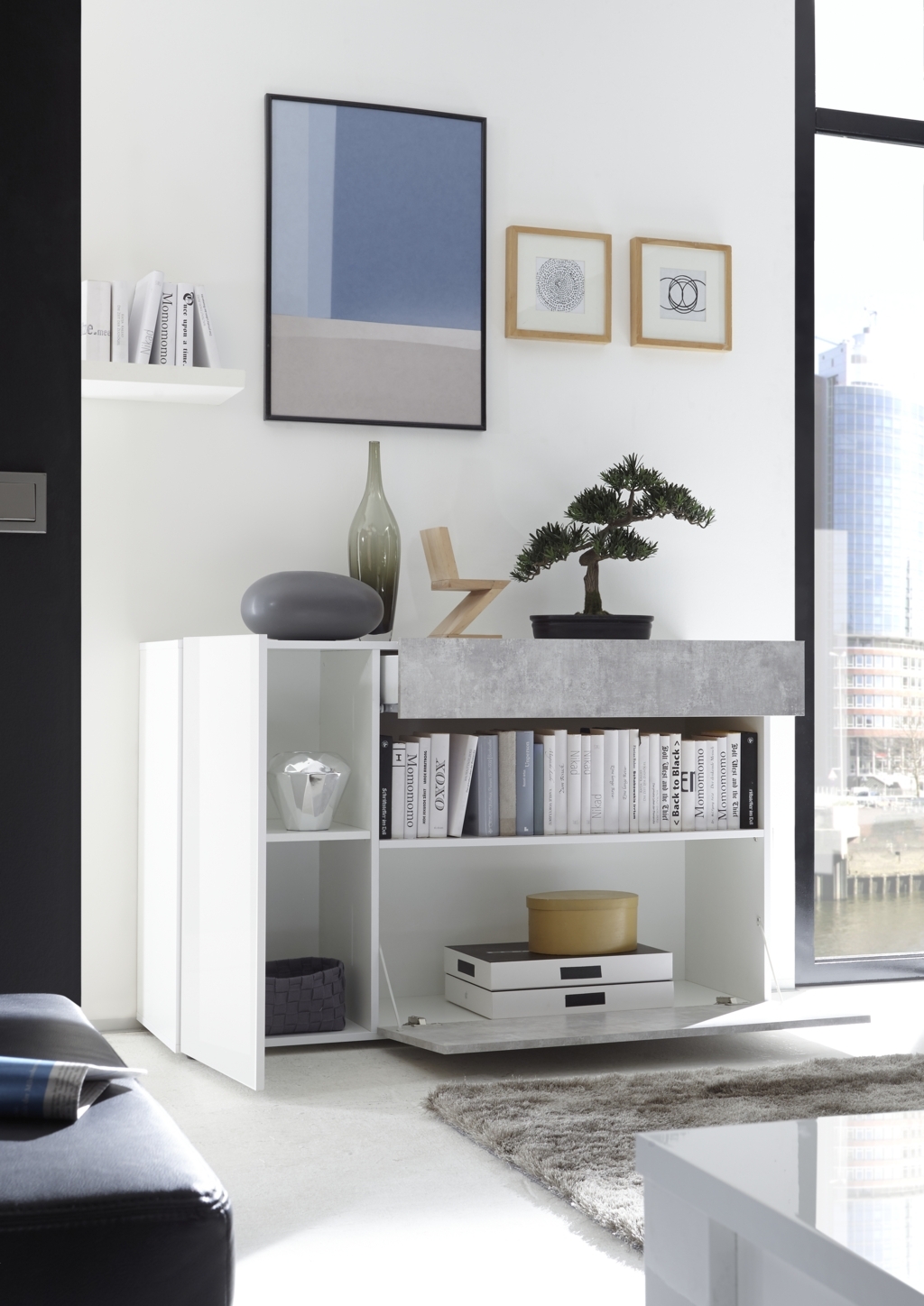 Pratico buffet moderno con anta, cassetto, vasistas e vano aperto per offrire il massimo della versatilità e praticità