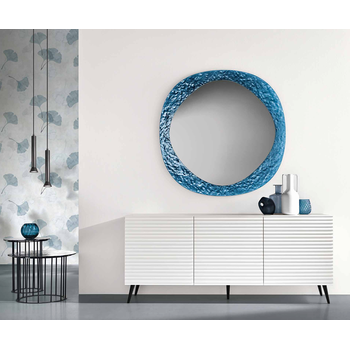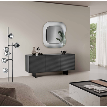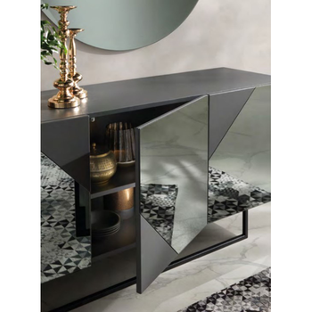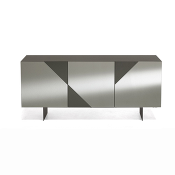 Madia con scocca in nobilitato ed ante in MDF rivestite in vetro specchio. Base in metallo verniciato nero o piedini a richiesta. Disponibile in 2 diverse finiture