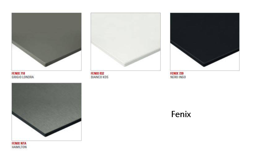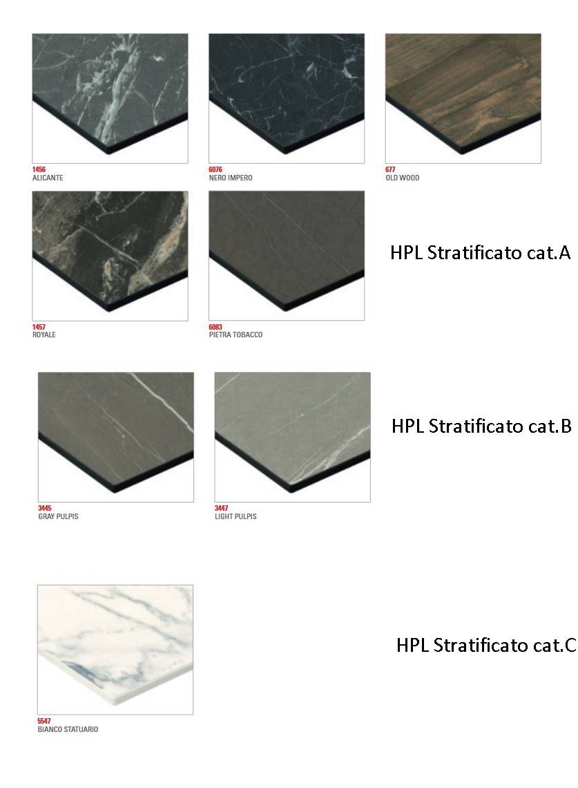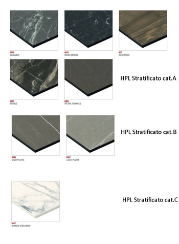 - HPL Laminato o FENIX stratificato sp. 10 mm bordi sagomati a botte e supportati su pannello MDF